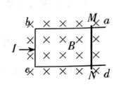光滑绝缘平台处于坚直向下的匀强磁场中, 磁感应强度大小为 $B$ 。质量为 $m$ 的矩形金 属框 $a b c d$ 右端开口, 放在平台上。其 $b c$ 边长为 $l$, 只有 $b c$ 边有电阻且为 $R, a b 、 d c$ 足够长。 质量也为 $m$ 的薄金属片 $M N$ 置于金属框上,与金属框间的动摩擦因数为 $\mu$, 接人金属框 间的电阻也为 $R$ 。现锁定 $M N$ (不能左、右运动), 用小锤给金属框一瞬时水平向右的冲 量 $I$,发现金属框能平移的距离为 $x$ 。则在这一过程中