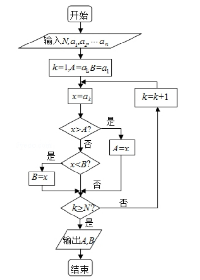 如果执行右边的程序框图, 输入正整数 $N(N \geqslant 2)$ 和实数 $a_{1}, a_{2}, \ldots$ , $a_{n}$, 输出 $A, B$, 则 ( )