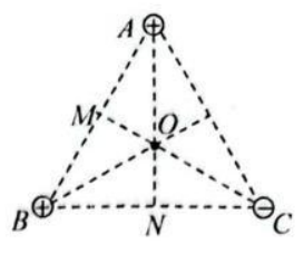 如图所示, $A 、 B 、 C$ 是等边三角形的三个顶点, $A B$ 边的中点为 $M$, $B C$ 边的中点为 $N, O$ 点为三角形的中心, 分别在 $A 、 B 、 C$ 固定放置 电荷量为 $+Q 、+Q 、-Q$ 的点电荷时, 下列说法正确的是