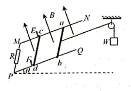 如图所示, 两光滑平行金属导轨 $M N 、 P Q$ 间距为 $L$, 与水平面成 $\theta=30^{\circ}, M P$ 间接 有阻值为 $R$ 的电阻。完全相同的两金属棒 $a b 、 c d$ 垂直导轨放置, 与导轨接触良好。两棒 面向上, 导轨电阻不计。开始时让 $a b 、 c d$ 静止于卡槽 $E F$ 处, 现用轻质绝缘细线一端连接 $a b$, 另一端绕过光滑定滑轮与重物 $W$ 相连, 用手托着重物 $W$ 使细绳伸直且佮无张力。访 手后重物 $W$ 下降的高度为 $x$ 时, $a b$ 棒的速度达到最大, 此时 $c d$ 棒对卡槽 $E F$ 恰好无压26. (20 分) 力。已知重力加速度为 $g$, 在 $a b$ 棒从开始运动 到最大速度的过程中,求: