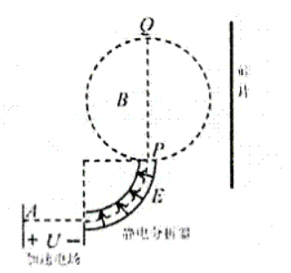 近年来我国芯片制造方面不断研究, 取得了不少进展。在芯片制造过程中, 粒子注入是其中一道重要的工序,其工作原理的示意图如图所示。静止于 A 的离子,经电压为U的加速电场加速后,沿图中半径为R的虚线通过圆弧形静点分析器(静点分析器通道内有均匀辐向分布的电场)后,从P点沿直径$PQ$方向进入半径也为R的圆柱形、方向垂直于纸面向外的匀强磁场区域,