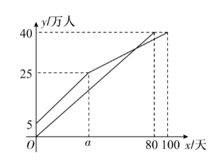 甲乙两地分别对本地各 40 万人接种某种疫苗,甲地在前期完成 5 万人接种后,甲、乙两地同时以相同速 度接种,甲地经过 $a$ 天后接种人数达到 25 万,由于情况变化,接种速度放缓,结果 100 天完成接种任 务,乙地 80 天完成接种任务,在某段时间内,甲、乙两地接种人数 $y$ (万人) 与各自接种时间 $x$ (天) 之间的关系如图所示.