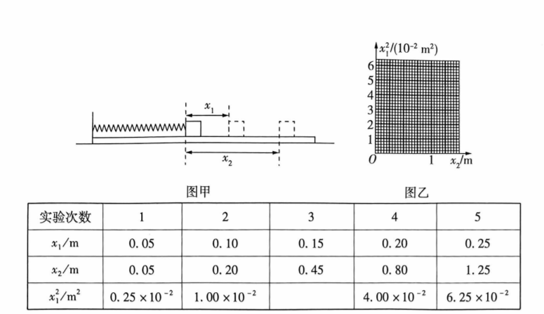 小明同学设计如图甲所示的装置进行测木块与长木板间动摩擦因数的实验, 将长木板水 平固定在水平试验台上, 在长木板的左端固定劲度系数为 $k=40 \mathrm{~N} / \mathrm{m}$ 的弹簧,在弹簧的自由端 放置一质量 $m=0.2 \mathrm{~kg}$ 的木块, 推动木块压缩弹簧, 当压缩量为 $x_1$ 时将木块由静止释放, 测得木 块释放后在长木板上运动的总距离为 $x_2$, 重复上述过程多次, 记录的数据如表所示。已知弹簧 存储的弹性势能与形变量 $x$ 的关系为 $E_{\mathrm{p}}=\frac{1}{2} k x^2$, 当地的重力加速度 $g=10 \mathrm{~m} / \mathrm{s}^2$ 。