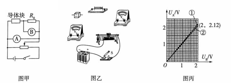 (3) 分别选用棱长为 $1 \mathrm{~cm}$ 和 $2 \mathrm{~cm}$ 的两导体块进行实验, 电路连接完成后, 闭合开关, 改变滑动 变阻器的滑片位置, 得到多组电表 $A 、 B$ 的示数, 作出的关系图线如图丙的图线(1)、(2)所示。