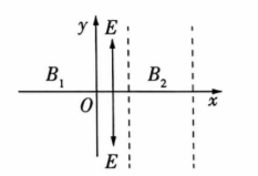 如图所示, 在 $x O y$ 平面内, $y$ 轴左侧存在宽度足够大、磁感应强度大小为 $B_1$ 的匀强磁场区域, 右 侧存在宽度为 $L_0$ 的匀强电场区域和宽度为 $2 L_0$ 、磁感应强度大小为 $B_2$ 的匀强磁场区域, 两磁场 区域中磁场方向均垂直于坐标平面向外, 电场以 $x$ 轴为界, 方向如图所示, 电场强度大小均为 $E$ 。 一质量为 $m$ 、带电荷量为 $+q$ 的粒子 (不计重力) 从 $y$ 轴正半轴上极其接近 $O$ 点的位置, 沿 $x$ 轴正 方向以速度 $v_0$ 射人电场区域, 射出电场时的速度方向与边界间的夹角为 $53^{\circ}$, 之后在右侧磁场中 运动时恰不从磁场右边界离开。 $\sin 53^{\circ}=0.8$, 则下列说法正确的是