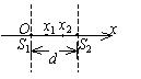 如图所示, 两相干波源在 $x$ 轴上的位置为 $S_1$ 和 $S_2$, 其间距离为 $d=30 \mathrm{~m}, S_1$ 位于坐标原点 $O$. 设波只沿 $x$ 轴正负方向传 播,单独传播时强度保持不变. $x_1=9 \mathrm{~m}$ 和 $x_2=12 \mathrm{~m}$ 处的两点是相邻的两个因干涉而静止的点. 求两波的波长和两波源间 最小相位差 .