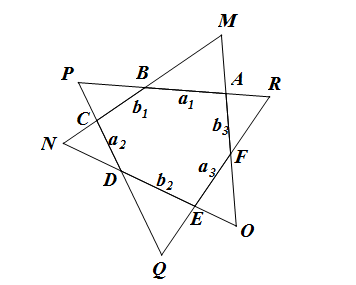 如图, $\triangle M N O$ 和 $\triangle P Q R$ 是两个全等的等边三角形. 六边形 $A B C D E F$ 的边长分别记为