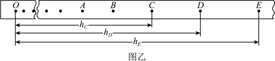 (2)在一次实验中,重物自由下落,在纸带上打出一系列的点,如图乙所示。在纸带上选取连续打出的5个点A、B、C、D、E。测得C、D、E三个点到起始点O的距离分别为 hC、hD、hE。已知当地重力加速度为g,打点计时器打点的周期为T。设重物的质量为 m,则从打下O点到打下D点的过程中,重物的重力势能的减少量为 ________ ,动能增加量为 ________ 。(用上述测量量和已知量的符号表示)。分析多组实验结果发现物体的重力势能减小量ΔEp略大于动能增加量ΔEₖ,这是因为 ________ 。