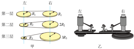 向心力演示器中三层塔轮的尺寸关系如图甲所示。把两个质量相同的小钢球分别放在长槽和短槽内,皮带处于塔轮第一层如图乙所示。稳定地摇动手柄使它们做匀速圆周运动,由此可以探究