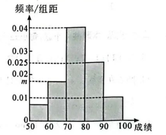 近期世界地震、洪水、森林大火等自然灾害频繁出现, 紧急避险知识越来越引起人们的 重视. 某校为考察学生对紧急避险知识的掌握情况, 从全校学生中选取 200 名学生进 行紧急避险知识测试, 其中男生 110 名,女生 90 名. 所有学生的测试成绩都在区间 $[50,100]$ 范围内, 由测试成绩数据作出如图所示 的频率分布直方图.
