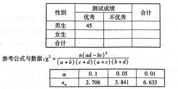 (2) 规定测试成绩不低于 80 分为优秀, 已知共有 45 名男生成绩优秀, 完成下面的列联表, 并 根据小概率值 $\alpha=0.05$ 的独立性检验, 能否 推断男生和女生的测试成绩优秀率有差异?