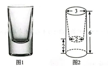 某玻璃制品厂需要生产一种如图 1 所示的玻璃杯, 该玻璃杯造型可以近似看成是一个 圆柱挖去一个圆台得到, 其近似模型的直观图如图 2 所示 (图中数据单位为 $\mathrm{cm}$ ), 则该 坡璃杯近似模型的体积 (单位: $\mathrm{cm}^3$ ) 为