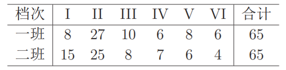 中国科学技术大学 2019 级本科新生入学考试中, 某学院两个班级的英语科目各档成绩(从低到高)人数如下表所示: