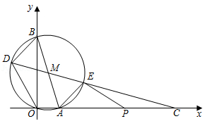 如图,在平面直角坐标系中, 圆M经过原点O ,分别交x轴、 y轴于点$A(2,0), B(0,8)$连结AB .直线CM 分别交圆M于点D ,E(点D 在左侧),交x 轴于点$C(17,0)$ ,连结AE