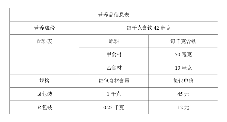 某公司生产的一种营养品信息如表.已知甲食材每千克的进价是乙食材的2倍,用80元购买的甲食材比用20元购买的乙食材多1千克.
