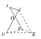 如图, 线段 $A B=C D, A B$ 与 $C D$ 相交于 $O$, 且 $\angle A O C=60^{\circ}, C E$ 是由 $A B$ 平移所得, 则 $A C+B$ $D$ 与 $A B$ 的大小关系是
