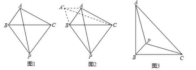 小伟是这样思考的: 利用变换和等边三角形将边的位置重新组合. 他的方法是以点 $B$ 为旋转中心将 $\triangle A B P$ 逆时针旋转 $60^{\circ}$ 得到 $\triangle$ $A^{\prime} B C$, 连接 $A^{\prime} A$, 当点 $A$ 落在 $A^{\prime} C$ 上时, 此题可解 (如图2).