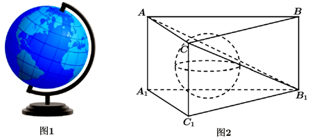 14. (本题 5 分) 地球仪是地理教学中的常用教具.如图 1 所示, 地球仪的赤道面(与转轴垂直)与黄道面(与水平面平行)存在一个夹角, 即黄赤交角, 大小约为 $23.5^{\circ}$. 为锻炼动手能力, 某同学制作了一个半径为 $4 \mathrm{~cm}$ 的地球仪(不含支架), 并将其放入坚直放置的正三棱柱 $A B C-A_1 B_1 C_1$ 中(姿态保持不变), 使地球仪与该三棱柱的三个侧面相切, 如图 2 所示.此时平面 $A B_1 C$ 恰与地球仪的赤道面平行, 则三棱柱 $A B C-A_1 B_1 C_1$ 的外接球体积为 .(参考数据: $\tan 23.5^{\circ} \approx 0.43$ )