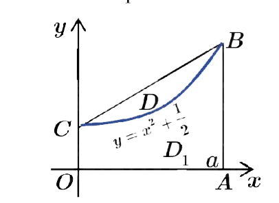 如图,设曲线方程为 $y=x^2+\frac{1}{2}$ ,梯形 $O A B C$ 的面积为 $D$ ,曲边梯形 $O A B C$ 的面积为 $D_1$ ,点 $A$ 的坐标为 $(a, 0), a>0$ ,证明: $\frac{D}{D_1} < \frac{3}{2}$.