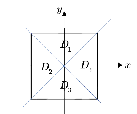 如图所示,正方形 $\{(x, y) \| x|\leq 1| y \mid, \leq 1\}$ 被其对角线划分为四个区域 $D_k(k=1,2,3,4) , I_k=\iint_{D_k} y \cos x \mathrm{~d} x \mathrm{~d} y$ ,则 $\max _{1 \leq k \leq 4}\left\{I_k\right\}=$